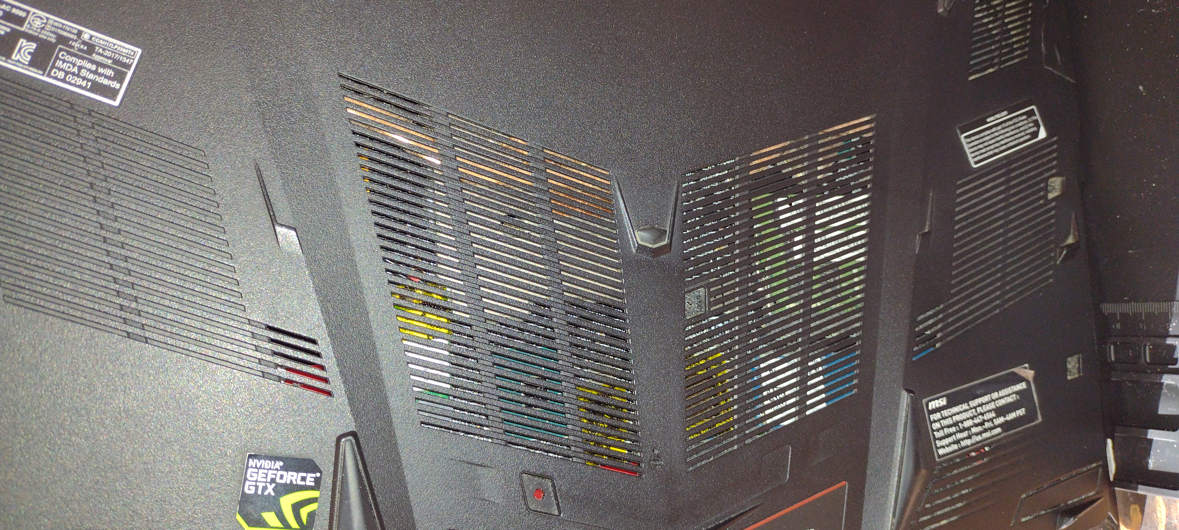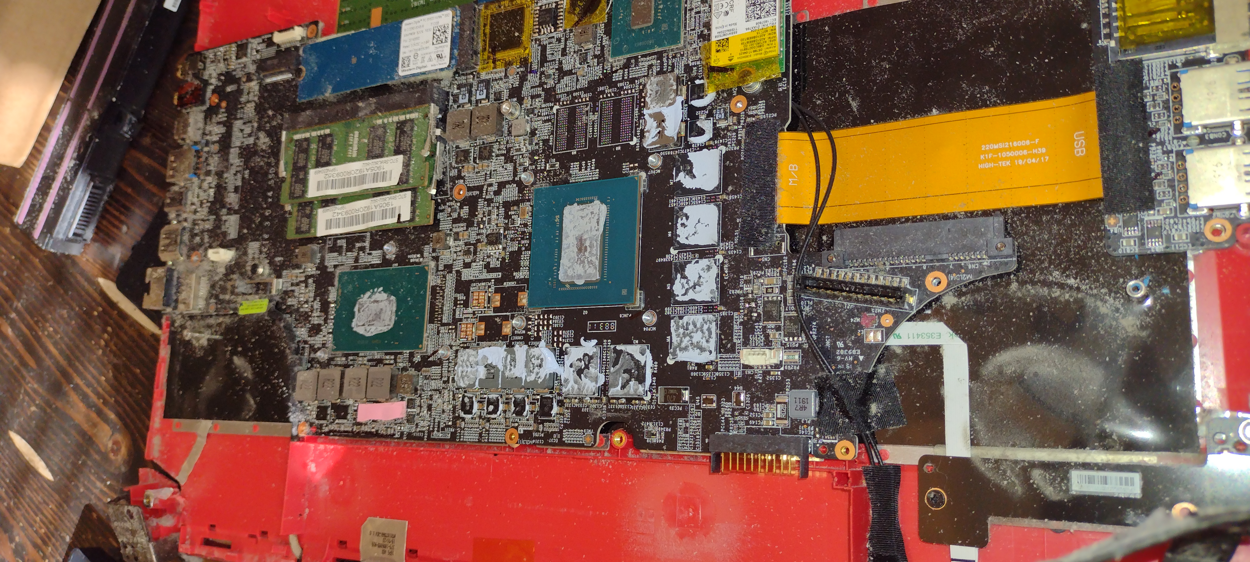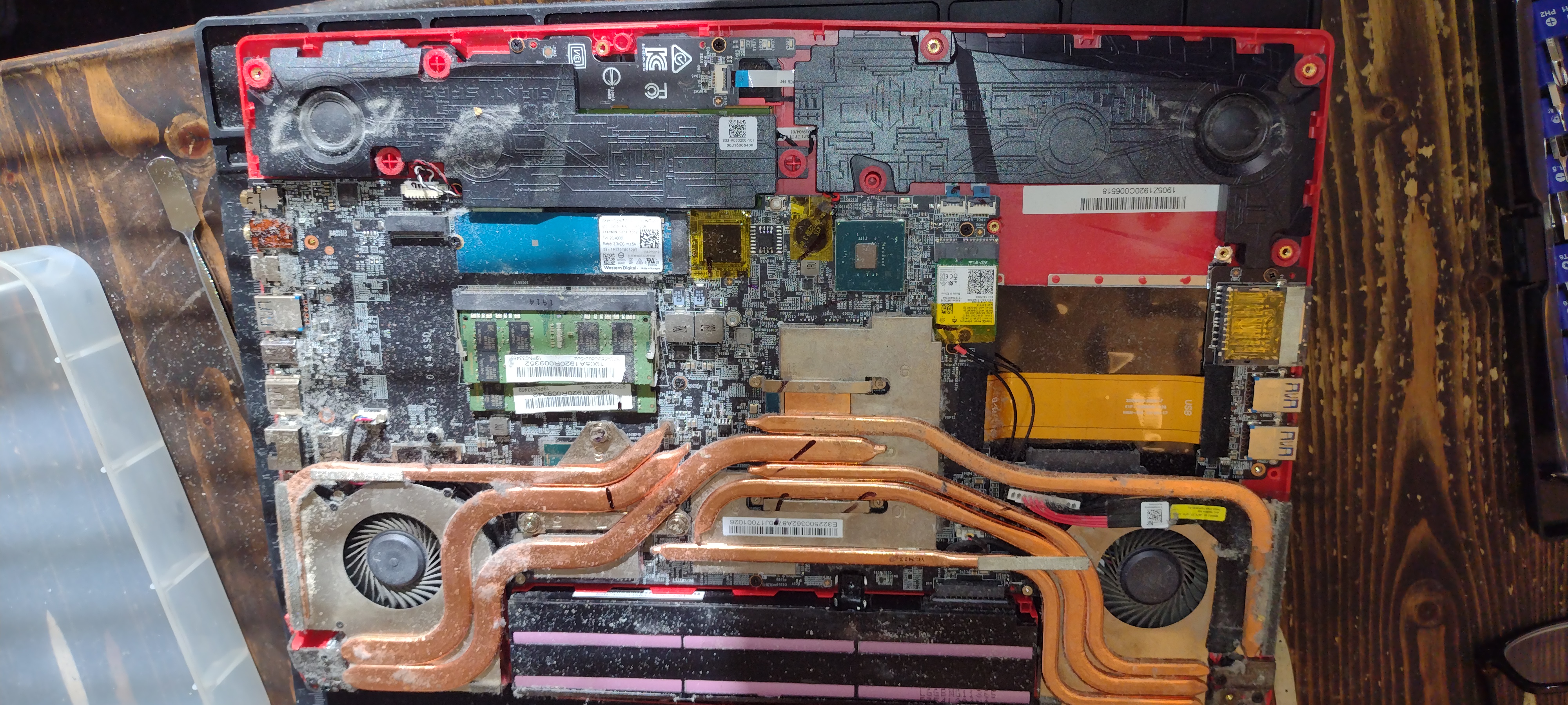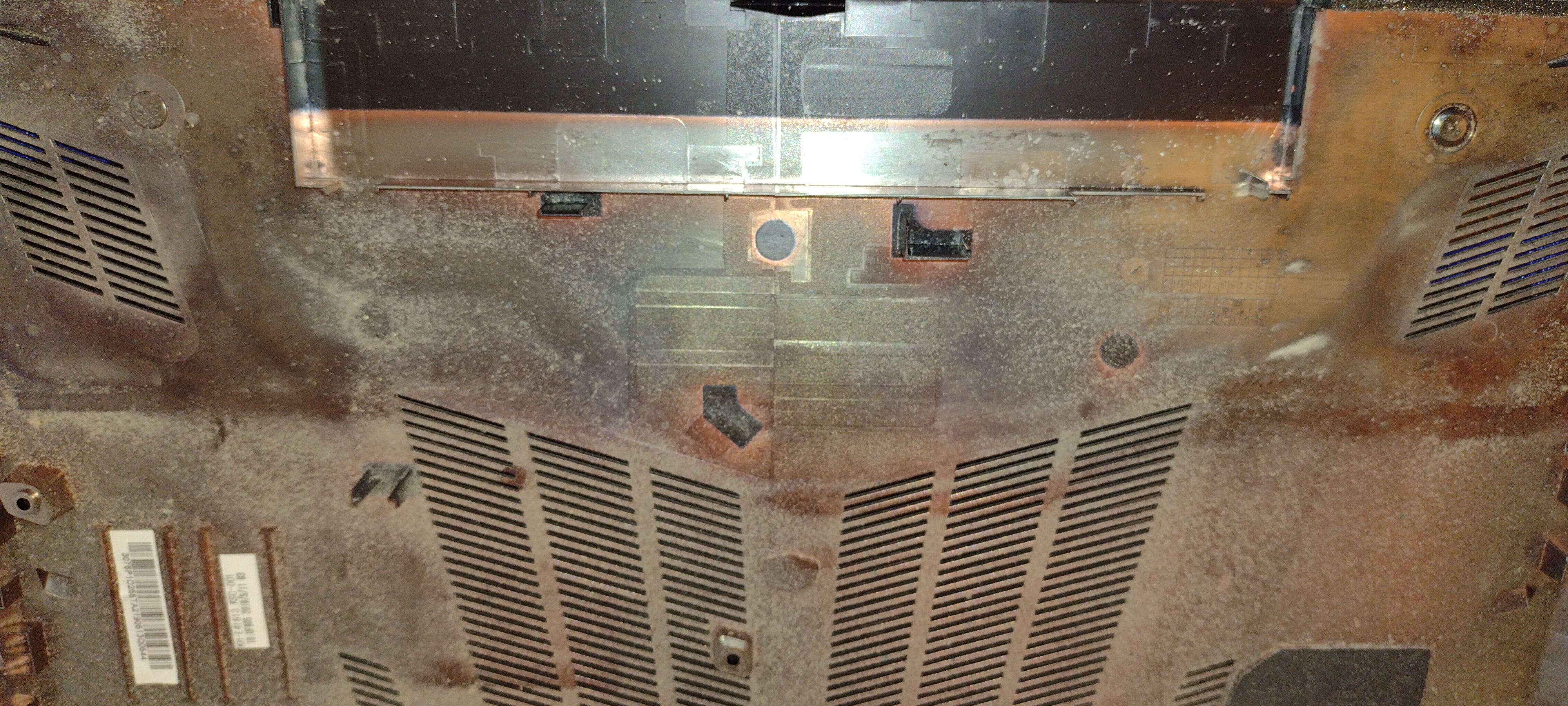 I had to be careful as I attempted to remove the bottom cover. The plastic around the fan vents was very brital and I didn't want to damage the case any further. The internals now revealed the System board is covered with fine dust.