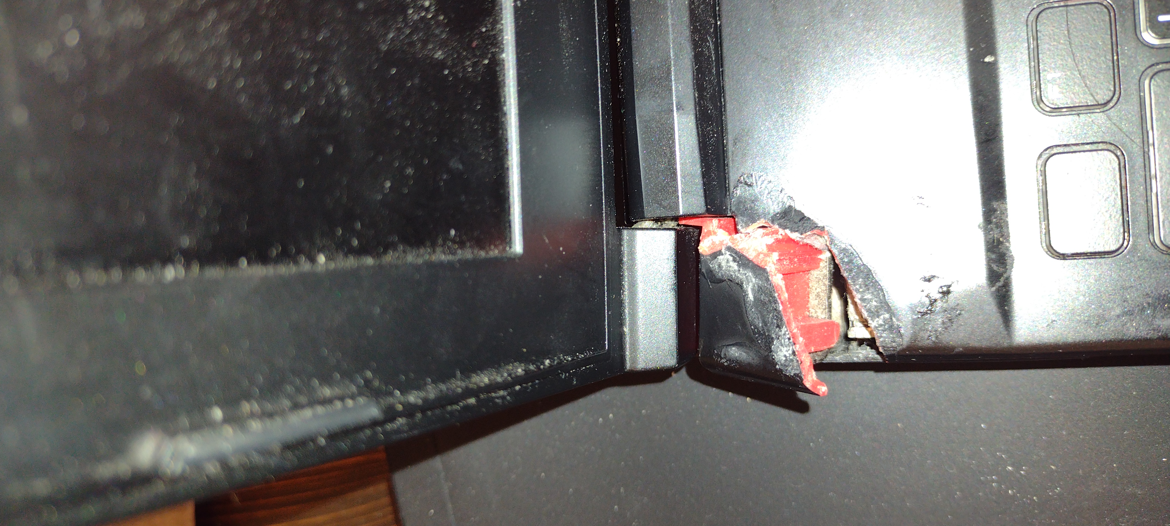 Close-up showing repaired corner after the laptop has been reassembled. The epoxy has now cured for 24 hours, the repaired corner is very strong, and should out last the laptop.