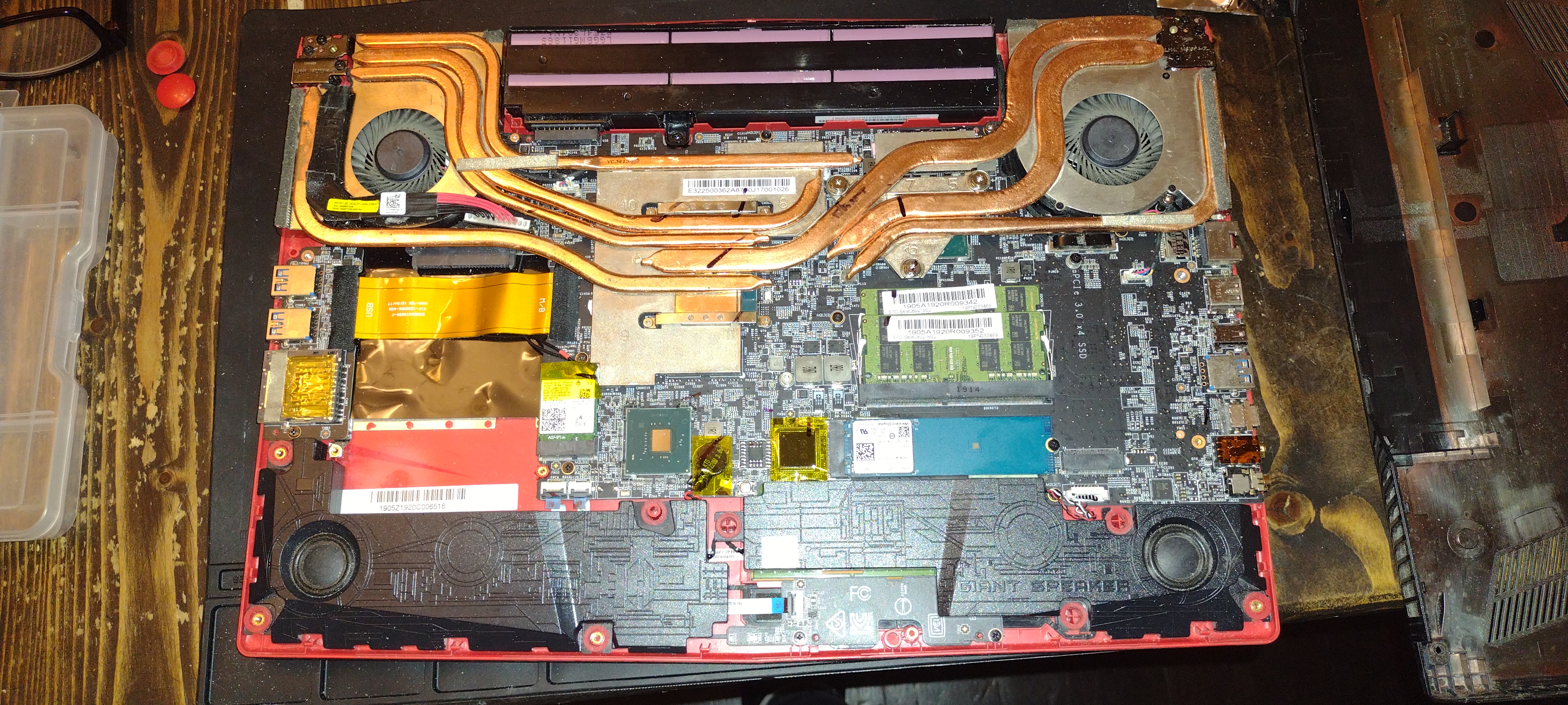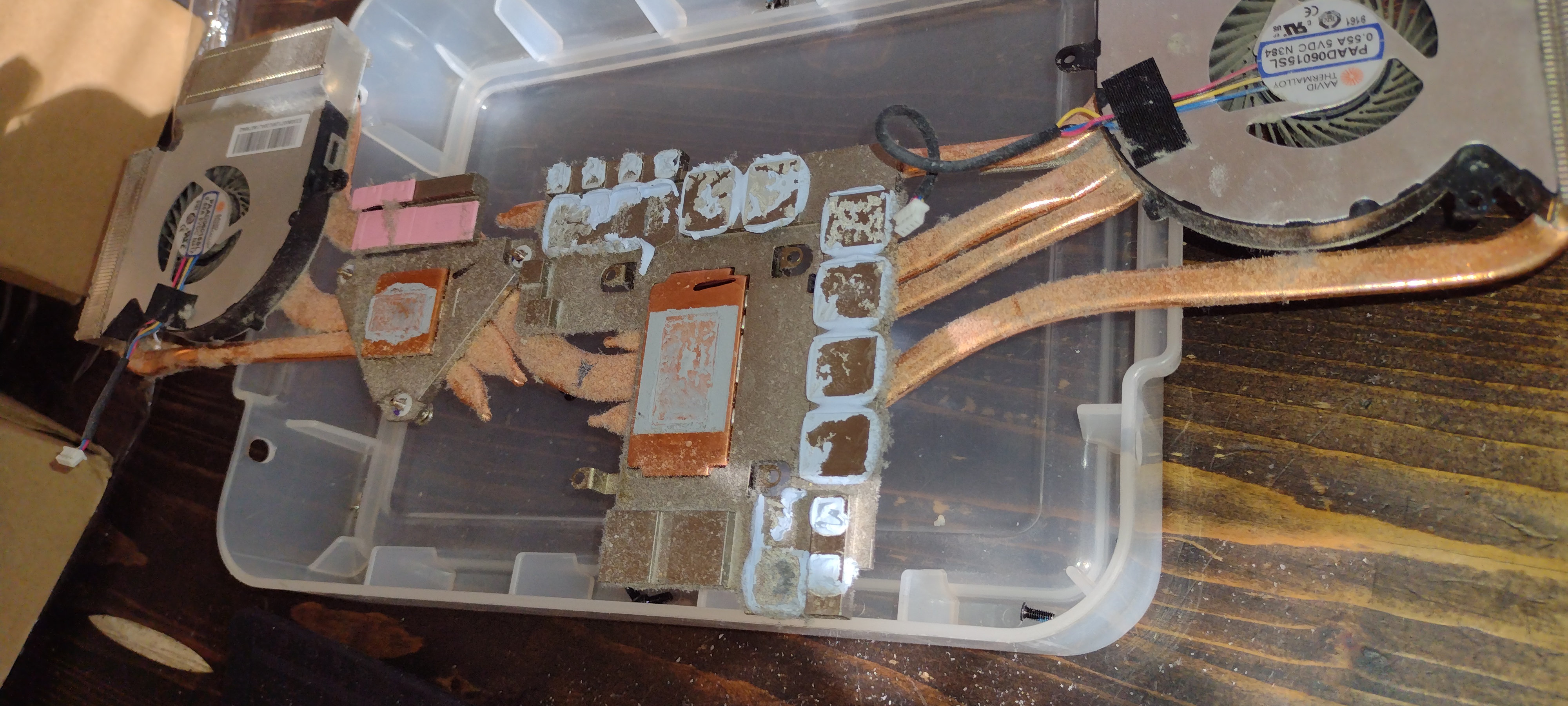 I cleaned up old thermal paste, then applied new thermal paste to critical areas. Then re-mounted the heat sink. Battery re-installed, Laptop is now ready to test.